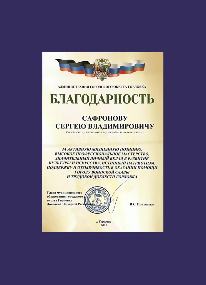 за активную жизненную позицию, высокое профессиональное мастерство, значительный личный вклад в развитие культуры и искусства, истинный патриотизм, поддержку и отзывчивость в оказании помощи городу воинской славы и трудовой доблести Горловка